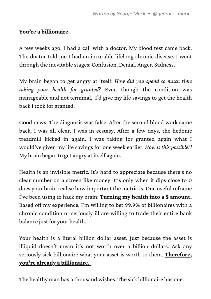 I read this on Twitter/X and thought this message is really valuable for the readers of my blog, too. So wanted to share this with you all here. The author of this is not definitely I (not yet a billionaire 😀) and the credit should entirely go to George Mack who goes by @george_mack on Twitter/X.